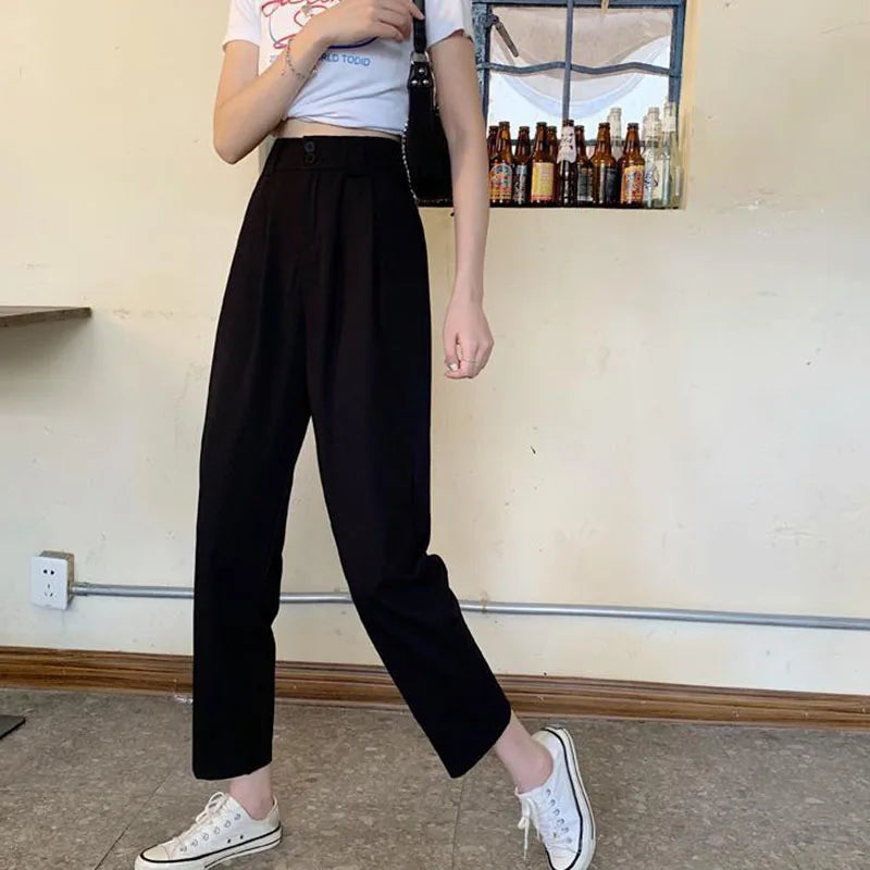 These Fashion Loose Streetwear Pants combine contemporary Korean elegance with comfort, perfect for casual outings or office wear. Crafted from a medium-stretch polyester blend, they offer a high-waisted fit with a loose silhouette that flatters various body shapes while ensuring ease of movement. The ankle-length design suits spring and summer seasons, providing a breathable and polished look. Available in deep gray or black, these pants feature a button fly closure and subtle flat-front styling without excessive decoration, making them versatile for multiple occasions. Sizes range from S to XXXL, with precise length measurements to ensure the ideal fit.