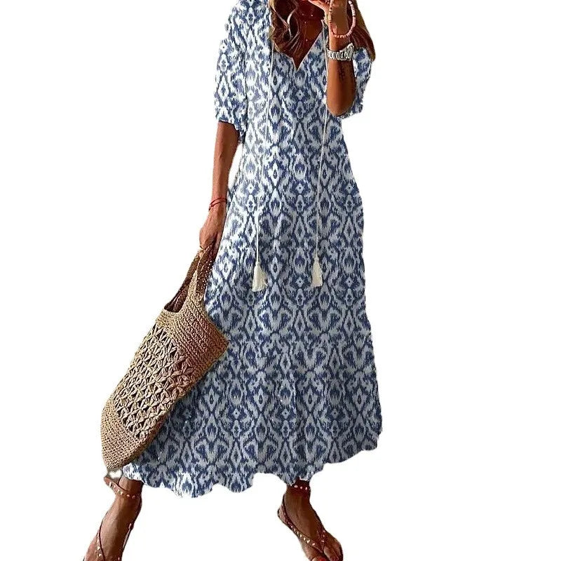 The Flower Print Bohemian Dress is crafted from high-quality polyester, offering a soft yet durable feel suitable for year-round wear. Designed with a flattering V-neckline and ankle-length silhouette, its loose fit and petal short sleeves provide both comfort and effortless elegance. The dress features a vibrant printed pattern with intricate tatting weaving details, enhancing its bohemian charm. Its versatile style makes it ideal for diverse occasions—from beach outings and casual streetwear to office settings and elegant parties. Non-stretch with a loose waistline, this breathable dress balances fashion and ease. Available for wholesale and dropshipping, it is a standout addition for spring, summer, autumn